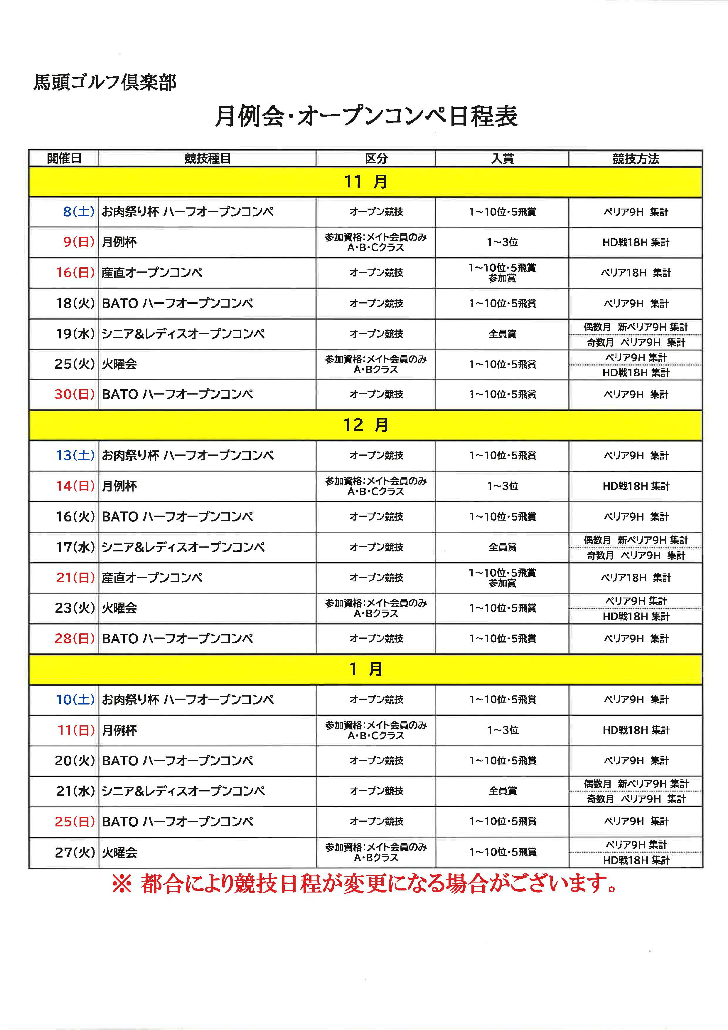 日程表内の【区分】が【オープン競技】となっているものがオープンコンペです。その他はクラス表記があるものがメイト会員様の競技となります。