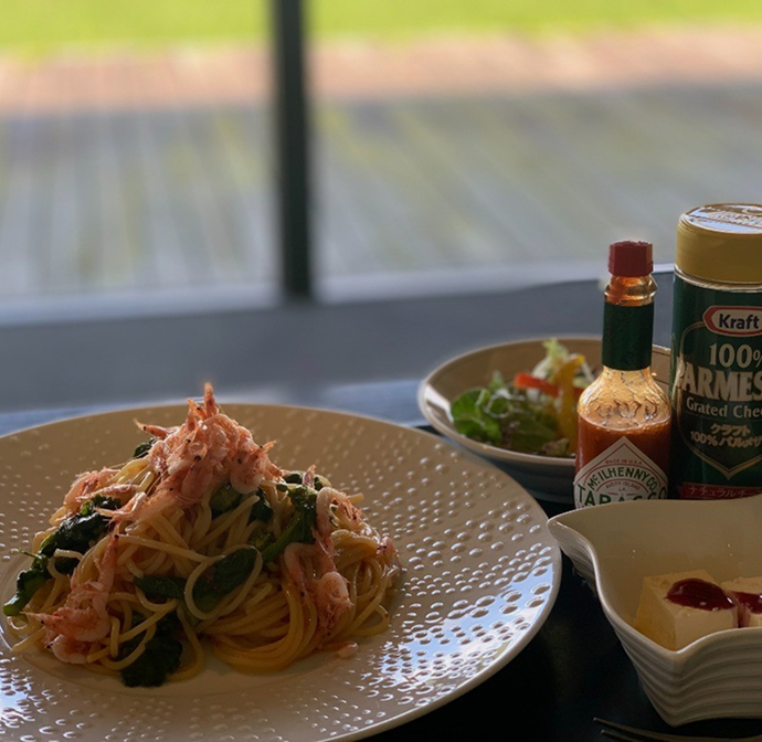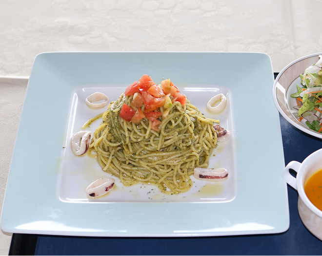 魚介とフレッシュトマトをバジルで爽やかに和えました。