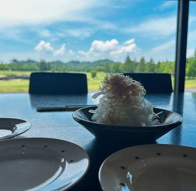 ガラス張りのレストランからはコースの景色が広がり、爽やかなひとときを楽しめます。スタッフが心を込めて用意した料理で、朝ごはんからラウンドの合間のお昼ごはんまで温かくお迎えします。